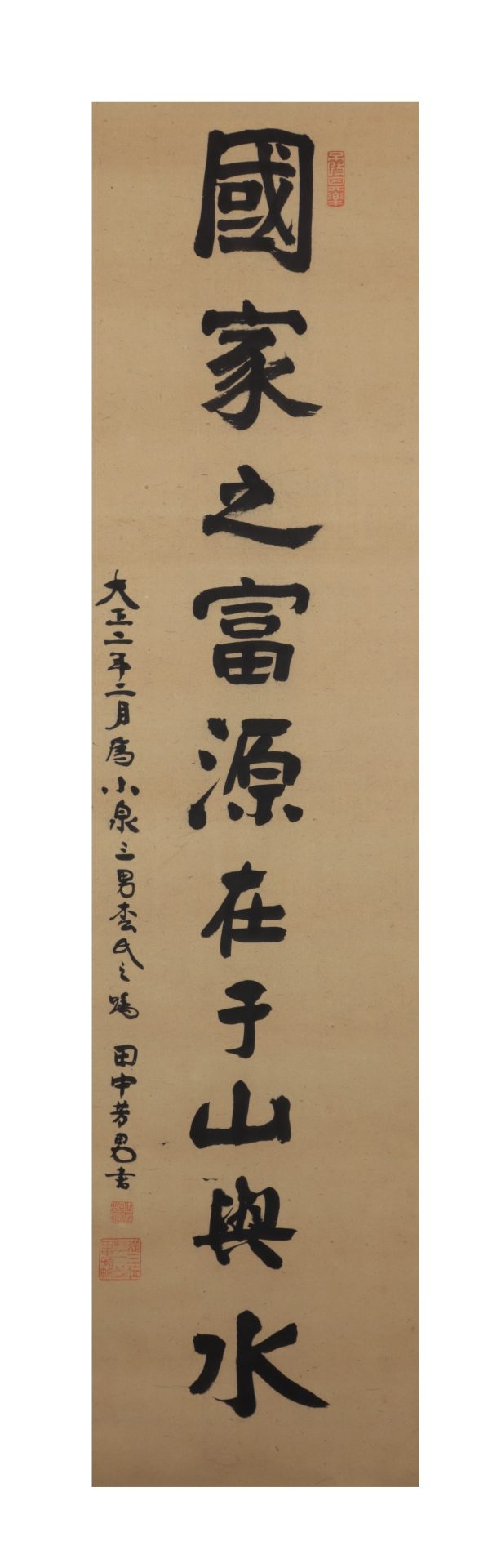 軸背墨書銘「田中先生書」。表具はがれ、破れ、軸端欠損ある。