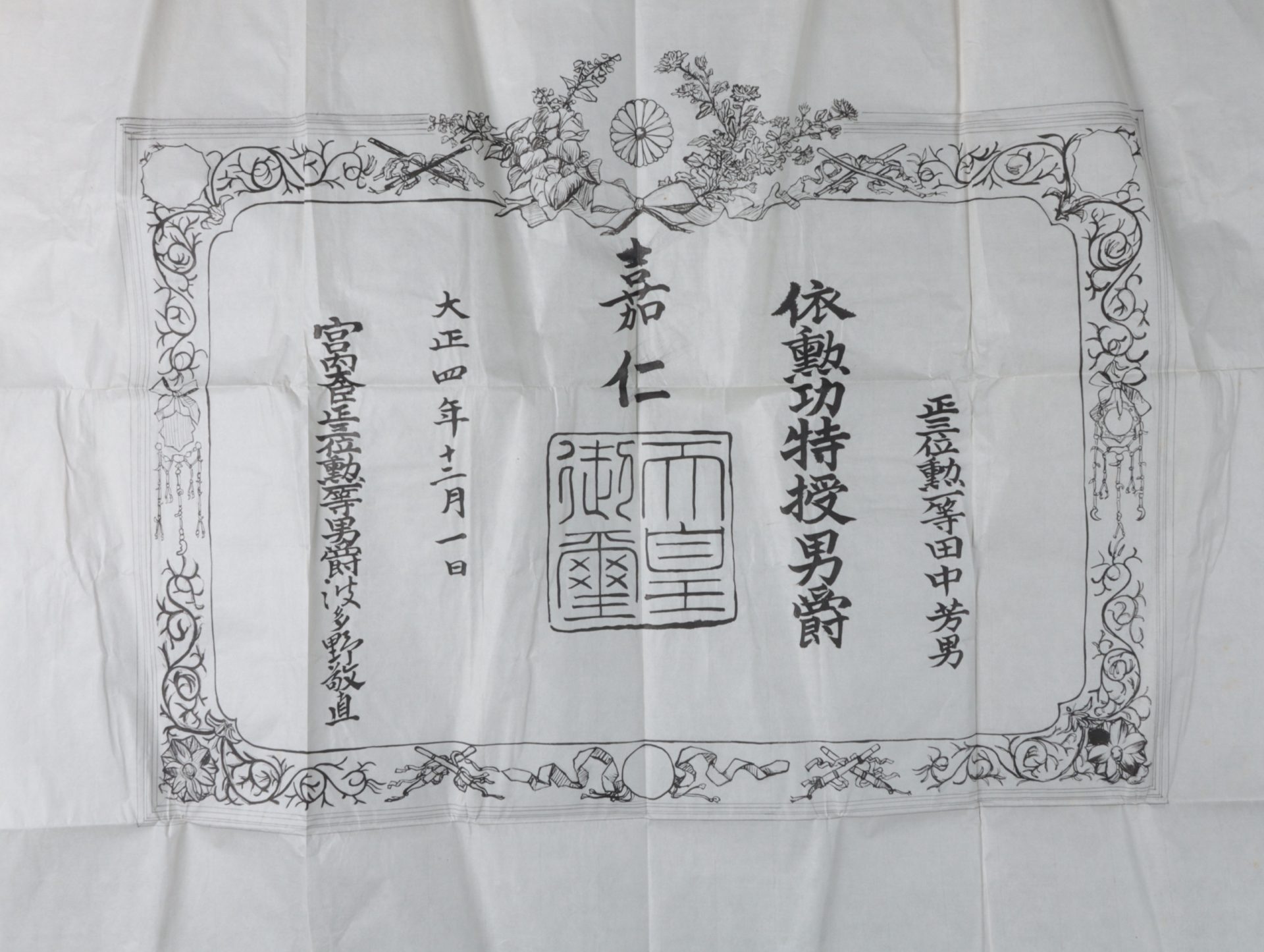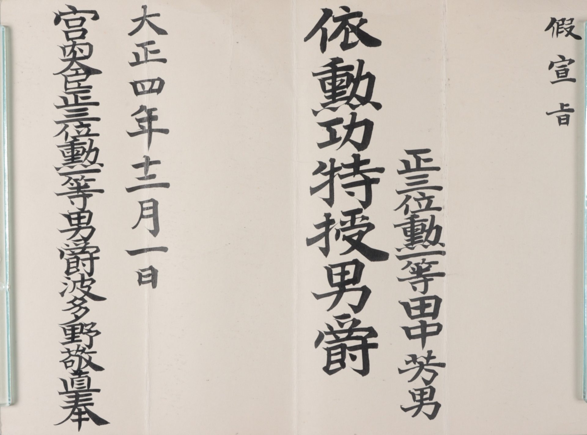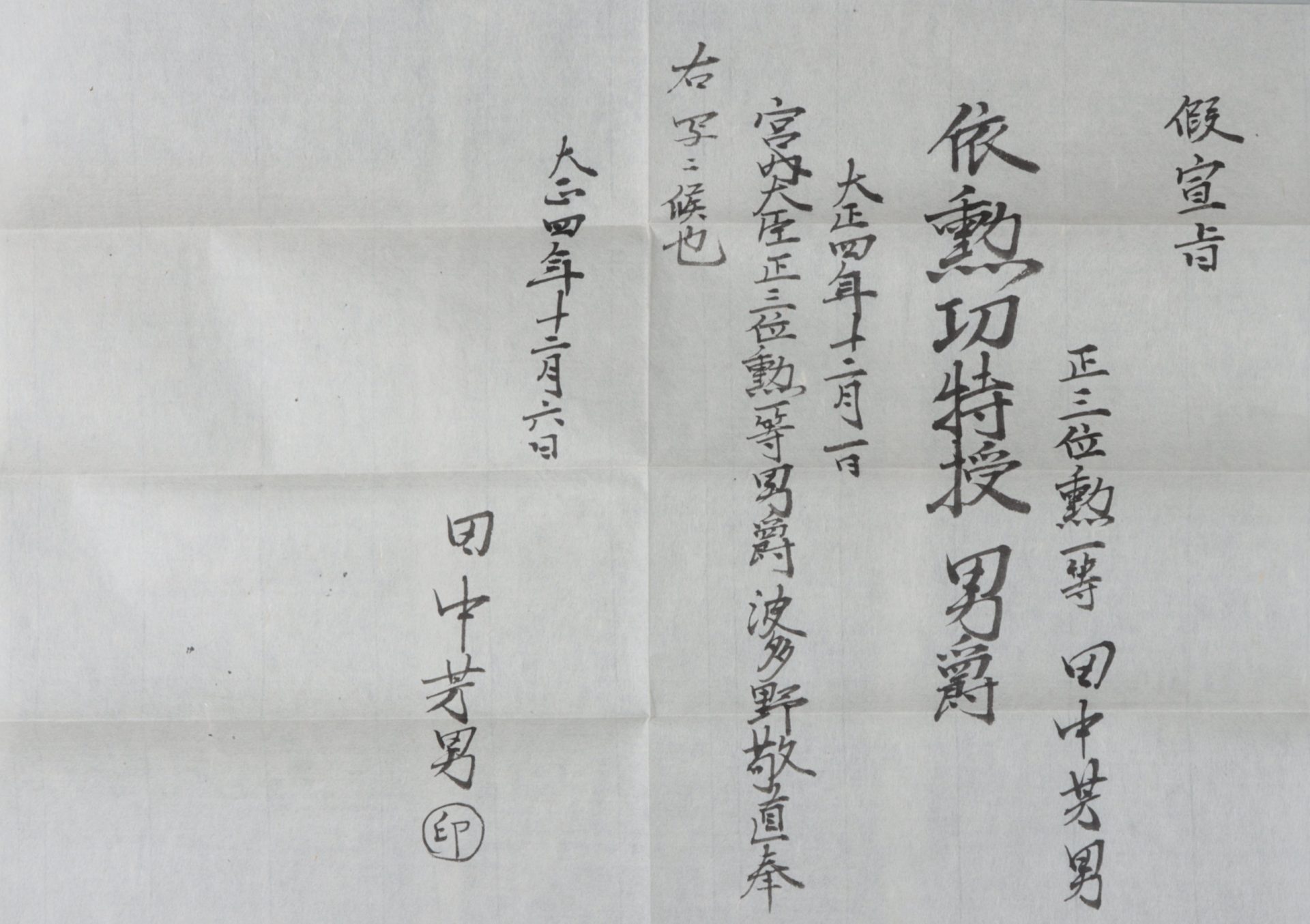 仮封筒入。大正4年の男爵授爵に関する書類一式。宣書及び諸届等同封