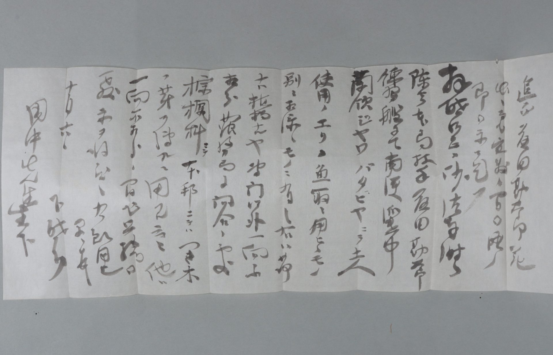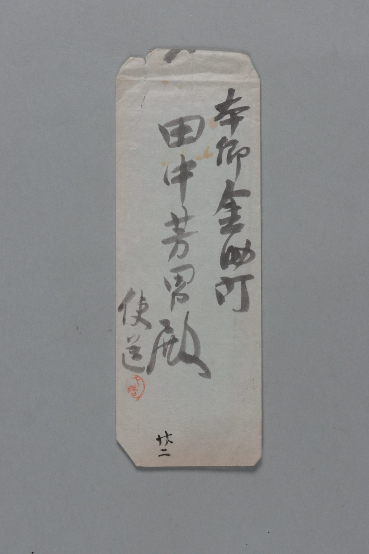 封筒入。本局技師藤田勘太郎が蘭領ジャワ・バタビアの土人が魚取りに用いるものが棕櫚科ではないか見てほしい。植物木片入りの封筒同封。封筒裏に朱書きで「質問の件棕櫚科植物の葉。見本を返す」と記されている