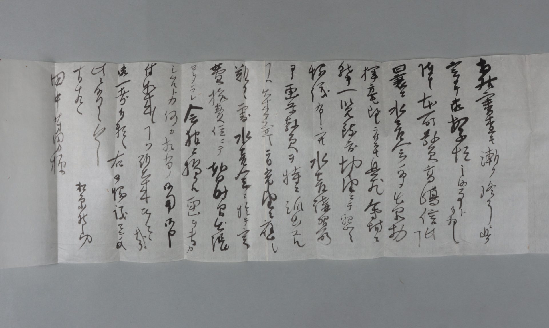 封筒入。水産会出品物に揮毫した当所教員高嶋信氏が会場を一覧したい希望を持っているが、水産講習所として画学教員を派遣することはできない。相談したい