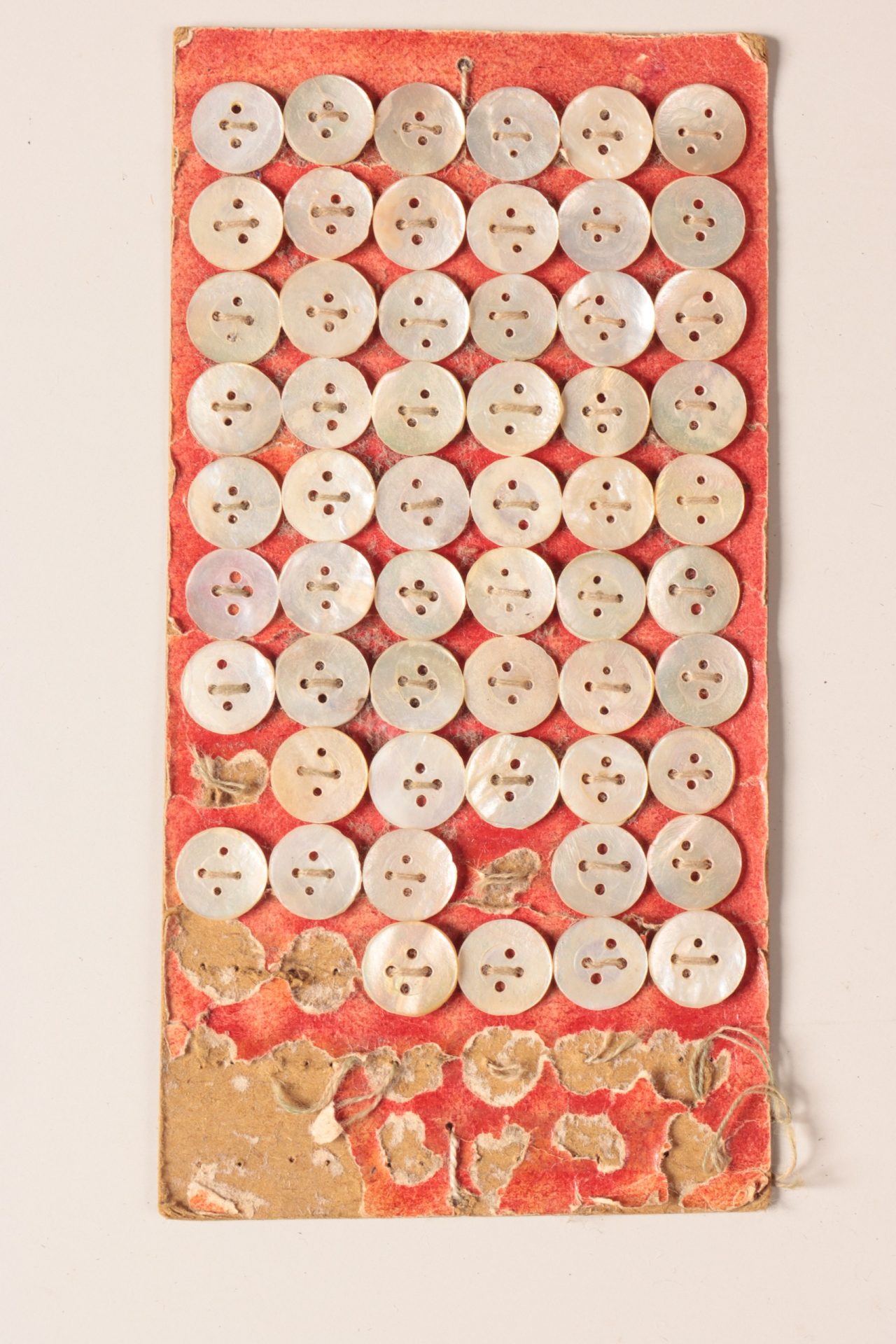 現状56個(16個亡失)。裏面墨書「明治十九年四月/水産共進会出品/三重県志摩布施田村/岩伏冨太郎製/真珠介釦 一ゴロスノ四」